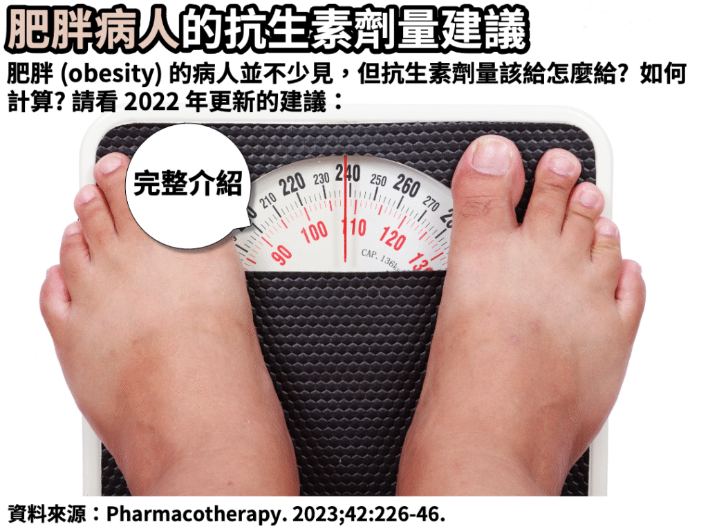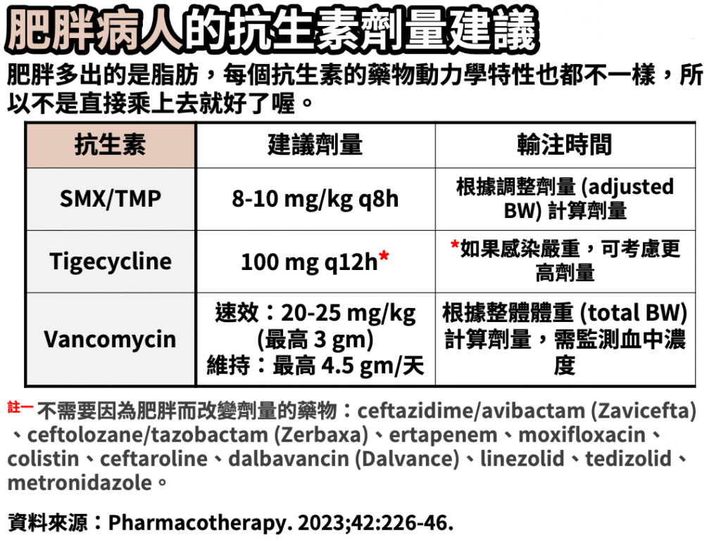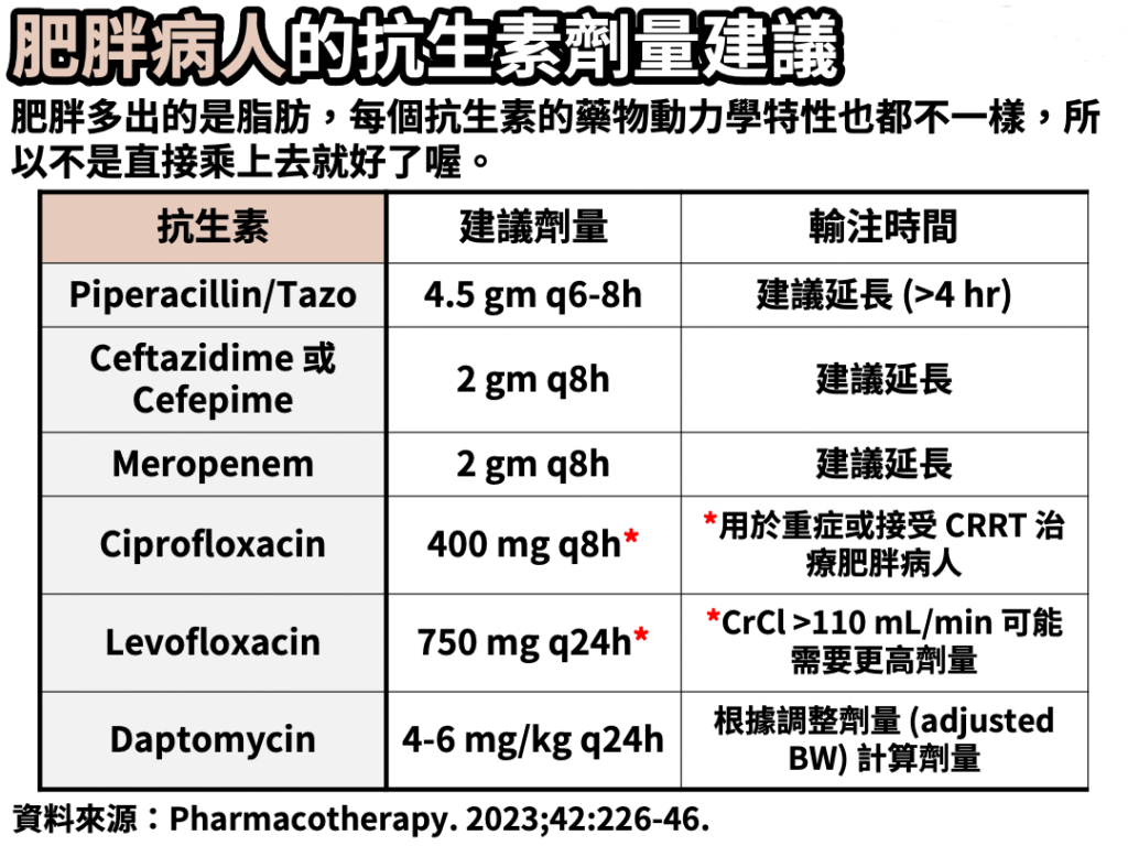 參考資料:Comprehensive guidance for antibiotic dosing in obese adults: 2022 update.